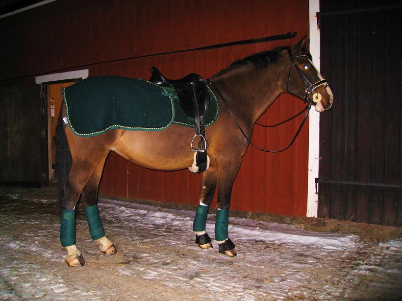 Det är mycket tillridning som gäller i första hand! Han har nog blivit felriden de senaste åren för han har såååå svårt att bli lösgjord och komma till korrekt arbete. När han väl blir lösgjord så rör han sig jättetrevligt och då känner man att han egentligen har en god ridbarhet, men tills man kommer dit är han spänd, kastar med huvudet, spänner ryggen osv. Så det blir ett litet projekt för mig, men det är ju sådant som jag tycker är roligt och jag har ju gjort det många gånger förut. Själva utbildningen av hästarna är ju det jag tycker är allra roligast med hästar och ridning, slutmålet är inte det som är viktigast för mig.
