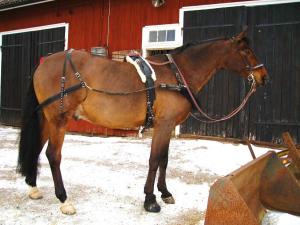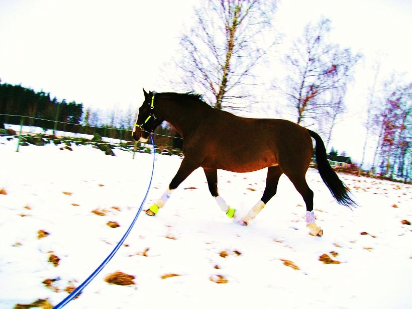 Suck. Longeringen arbetar emot mig just nu! Igår hade jag ju skräckupplevelsen med Alice och idag när jag longerade Blixten blev han busig och kutade runt och trampade då av sig en sko och efter att skon flög av tappade han fästet och halkade omkull! Suck. Verkar dock inte blivit mer än ett par skrapsår, som tur är. Efter det provade jag lite tömkörning igen för andra gången. Han har nog aldrig tömkörts förut för han fattar inte riktigt vad han ska göra och vad det hela går ut på, men det gick hyfsat efter ett tag. Provade selet på honom idag och kan nog ha det ifall jag bestämmer mig för att prova att köra in honom, får bara göra några extra hål för bukgjorden.