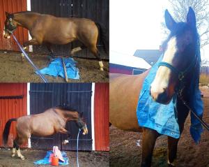 Alice är så stor och ung att jag inte gärna jobbar henne inspänd på så liten volt som det blir på gårdsplan så med henne blev det lite… lek och miljöträning kan vi väl kalla det! Tog en bit av en blå presenning och viftade och prasslade med och lade den sedan över henne. Hon brydde sig inte alls, vilket jag inte hade trott heller med tanke på att vi tränat på detta redan när hon var föl!