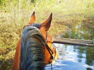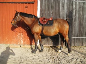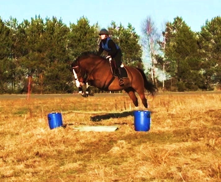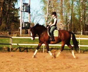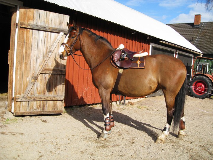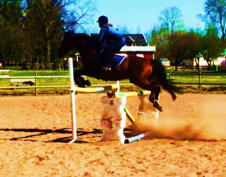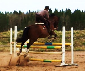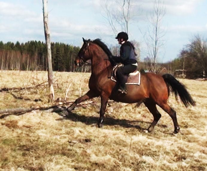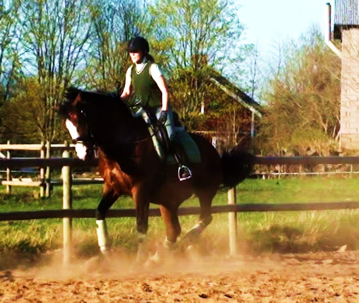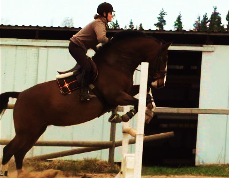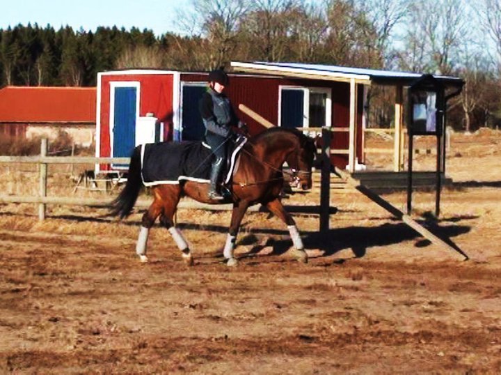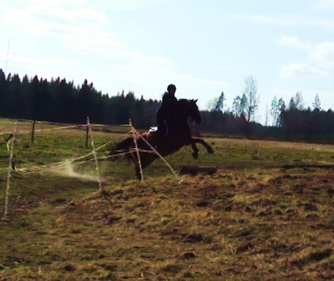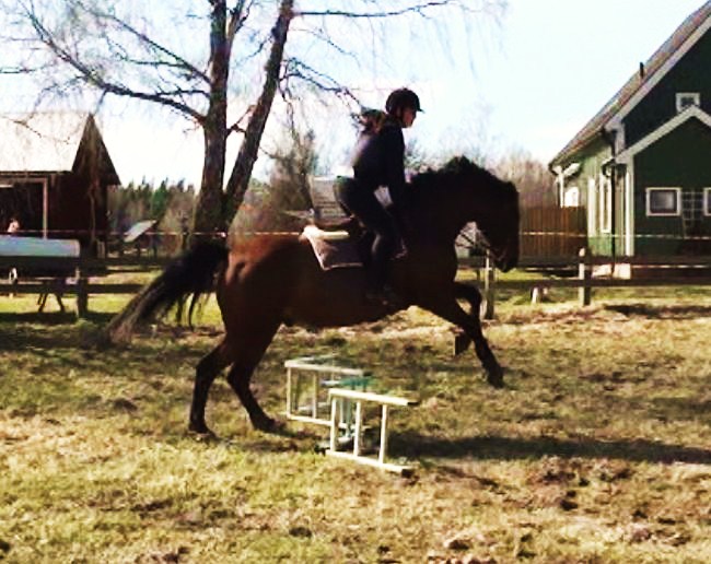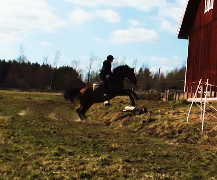 Inte verkade hon ha ont någonstans heller, kollade noggrannt både före och efter ridpasset, reagerade inte på något. Tror inte heller att det är sadeln för det är den enda sadel jag hittills provat som faktiskt sitter bra. Den har rätt bomvidd, är tillräckligt rak för hennes spikraka rygg, har bred kanal för ryggraden och är nystoppad (mjukt och sviktande). Sen rider väl inte jag mitt bästa just nu, men inte SÅ illa att hon skulle reagera så. Hon gick ju minsann bra med mig på ryggen när vi hoppade för ett par dagar sedan. Här kommer en bild från när det gick bra några sekunder…
