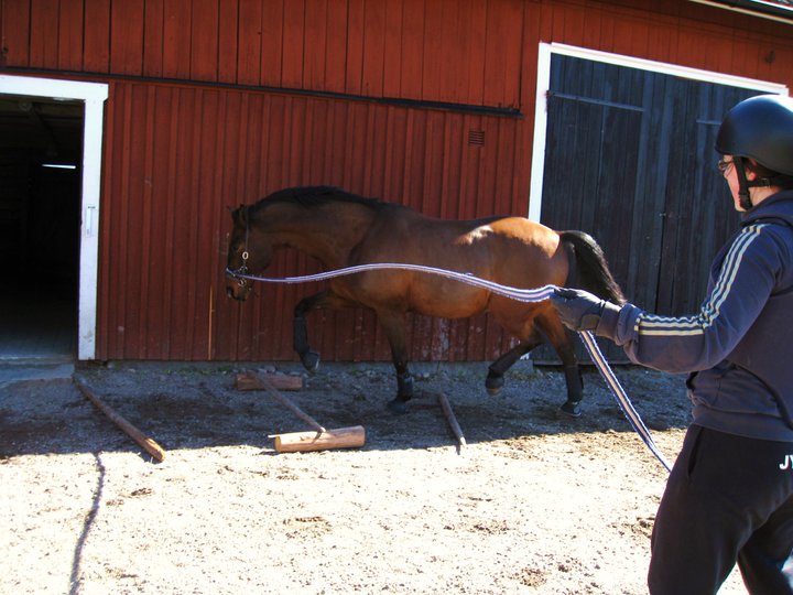 Sara var här idag och longerade Blixten över travbommar på böjt spår. Dacke fick sig en promenad tillsammans med Sara, vilket var väldigt uppskattat!