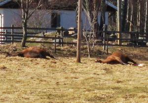 Eget exempel från gårdagen: Jag fick bråttom till banmötet och tog då inte av de tunna regntäckena (helt ofodrade) som hästarna hade utan tänkte att det kan jag göra när jag kommer hem. Sagt och gjort, när jag kom hem åkte täckena av – till hästarnas stora förtjusning! På de stackars timmarna som Alice gått med tunnt regntäcke i gårdagens soliga och varma vårdag hade hon dock redan hunnit få värmeutslag och hon såg väldigt trött ut!! Detta trots möjligheter till skugga i hagen. Snacka om att jag fick dåligt samvete! Så hon har gått helt naken nu, även på natten och trivs som fisken i vattnet! 🙂