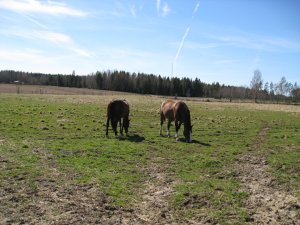 Jag har nog aldrig släppt hästarna på sommarbete så här tidigt (vad jag minns i alla fall), men vädret är ju helt underbart, gräset har börjat komma, de har ju sin ligghall (dygnet runt, året runt) och kommer ha tillgång till höet på nätterna. Dagtid är det Dacke som har tillgång till höet då han fått en ny – och större – hage till hans stora glädje! De två andra kommer att gå i bägge sommarhagarna och därmed ha flera hektar att gå på. Kommer ladda upp bilder på hästarna någon gång idag.