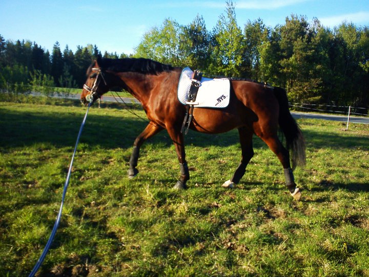 Blixten fick sig ett longeringspass idag. Han blev väldigt busig och brallade runt med diverse akrobatiska luftkonster! Han blev så till sig att han helt plötsligt låg på marken (det var inte på grund av underlaget, han var till och med broddad). Det roliga var att istället för att bli skärrad och/eller skynda sig upp som de flesta hästar skulle reagerat så bestämde han sig för att rulla sig – när han ändå låg på marken. Hahah – han är ju så underbart knasig den hästen!
