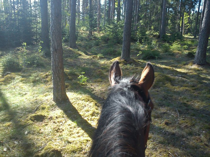 Med Dacke blev det en barbacka skrittur ute i skogen. Det var jättemysigt! Han har världens goaste rygg att sitta barbacka på. Det enda som inte är bra med det är att en längre stund på den ryggen blir påfrestande för mina dumma höfter. Men, sådana turer som han kan göra nu funkar bra! Han blev jätteglad när jag red till vattenhålen där han försökte trava hela tiden! Kul att han tycker det är så roligt, men han får nöja sig med skritt så här långt.