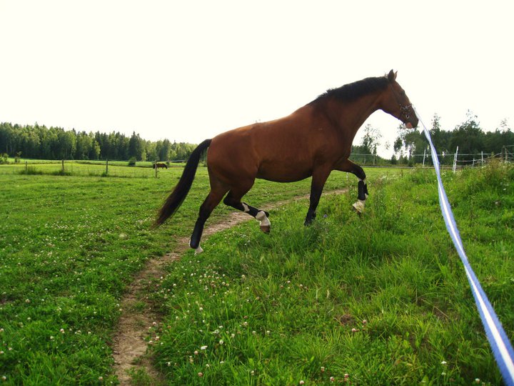 Igår var det ett helt OK ”hästmotioneringsväder” med mulet och blåst så jag högg tag i Alice och skulle ut och longera i stora hagen som är kullig/backig och har upp-/nerhoppet – den perfekta hagen att träna styrka och kondition i! Vad händer då? Jo, jag hinner inte mer än börja longera så blir det solsken, varmt, avtagande blåst och en svärm av blinningar kom från ingenstans och anföll oss! Suck. Men, jag ville ändå köra på så gott det gick för hon behövde röra på sig då hon stått lite för många dagar. Stackars Alice blir ju dock precis tokig av blinningar så hon kunde ju inte skritta alls så hela passet blev i trav och galopp – med andra ord: väldigt intensivt. Stackars stumpan, men det var bra träning i alla fall. Nedan en bild från gårdagen, fler kommer att laddas upp i galleriet inom kort.
