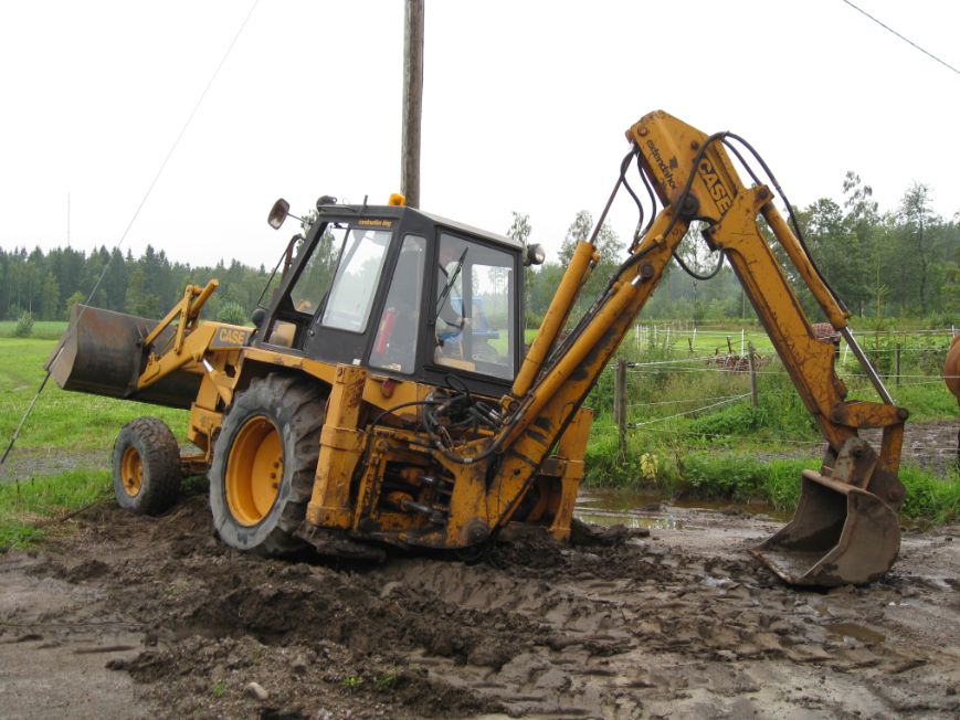 Allt gick dock inte som det skulle. Magnus använde traktorgrävaren för att rätta till plintarna som håller uppe ytterväggarna på byggnaden (de hade börjat skeva på grund av tjäle) och när han var klar så kom han inte därifrån! På grund av det kraftiga regn som kommit hade det uppgrävda området (som är tänkt till tillbygget) blivit alldeles genomsurt så han fullkomligt grävde ner sig. Men, med lite assistans kom han till slut loss.