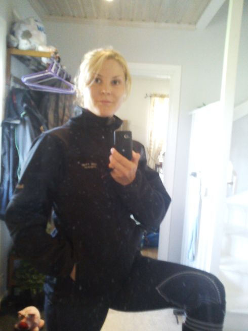 Idag matchade vi i svart och vitt. Jag hade svart softshell-jacka, ridbyxor i svart stretchdenim med vita sömmar, svart hjälm, svarta stövlar. Alice hade vitfodrat, svart träns, svart sadel, svart sadelgjord med vitt fårskinnsfoder, svart schabrak med en grå och en vit rand, vita benskydd med svarta detaljer samt vita boots.