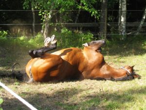 Väl hemma igen sprayade jag på lite extra insektsmedel och gick istället ut i hagen och red och det – däremot – gick alldeles utmärkt. Hos oss hade vi lite knott och någon fluga här och där, men inget så som det var i skogen. Så det blev lite av en repris av ridpasset vi gjorde i förrgår, men lite mer träningsinriktat idag (då var det mest rida av överskottsenergi det gick ut på). Uppvärmningen blev mestadels klättring i samtliga gångarter och själva arbetet blev hoppning på stor volt över de nedfallna träden. Hon var jätteduktig!