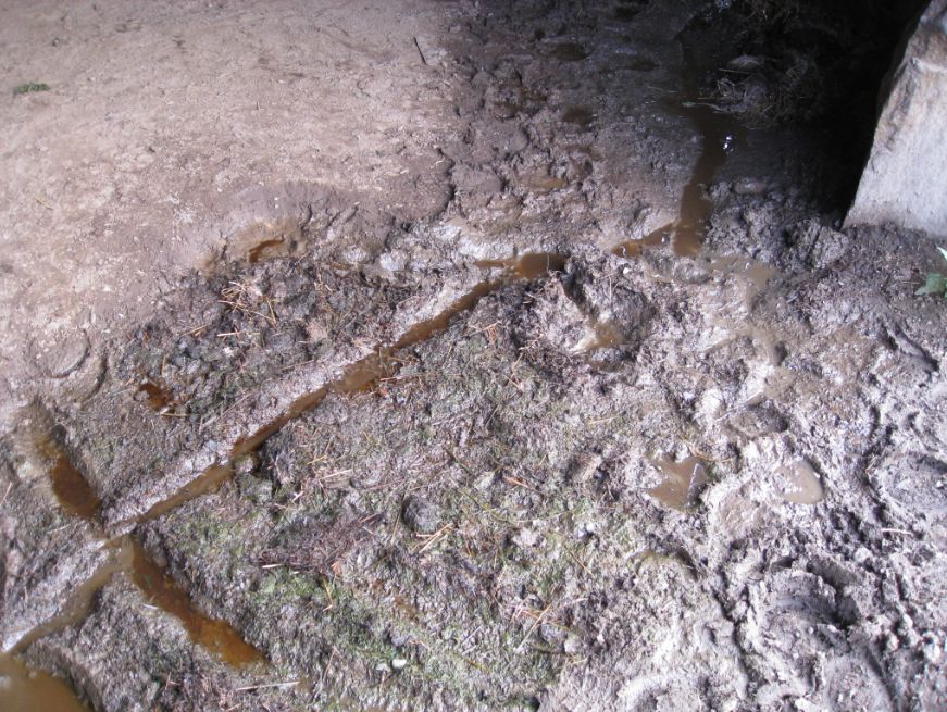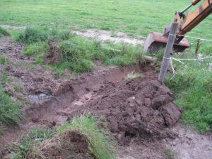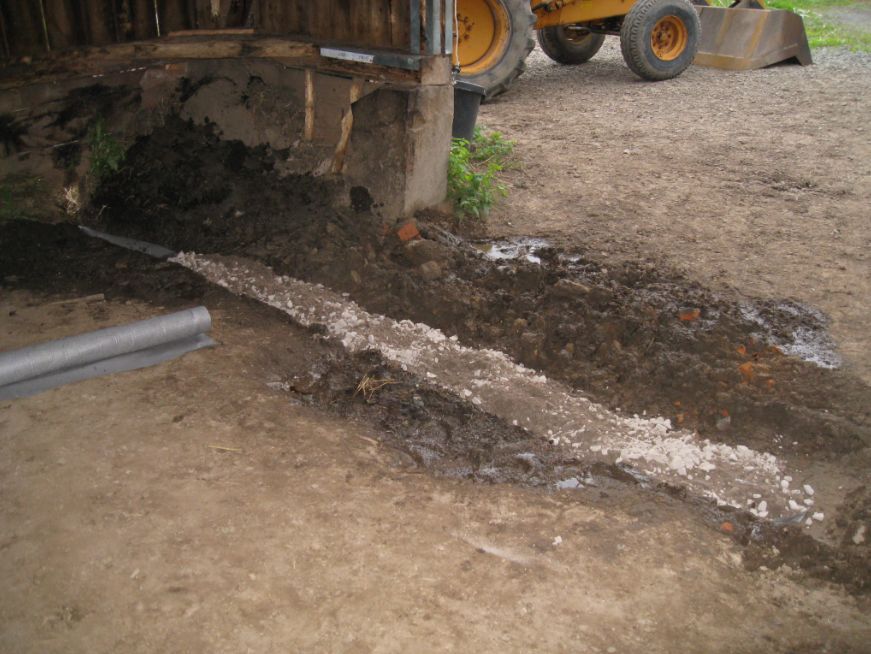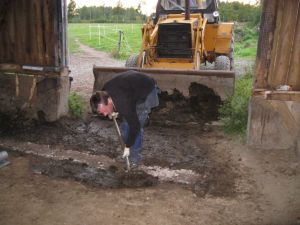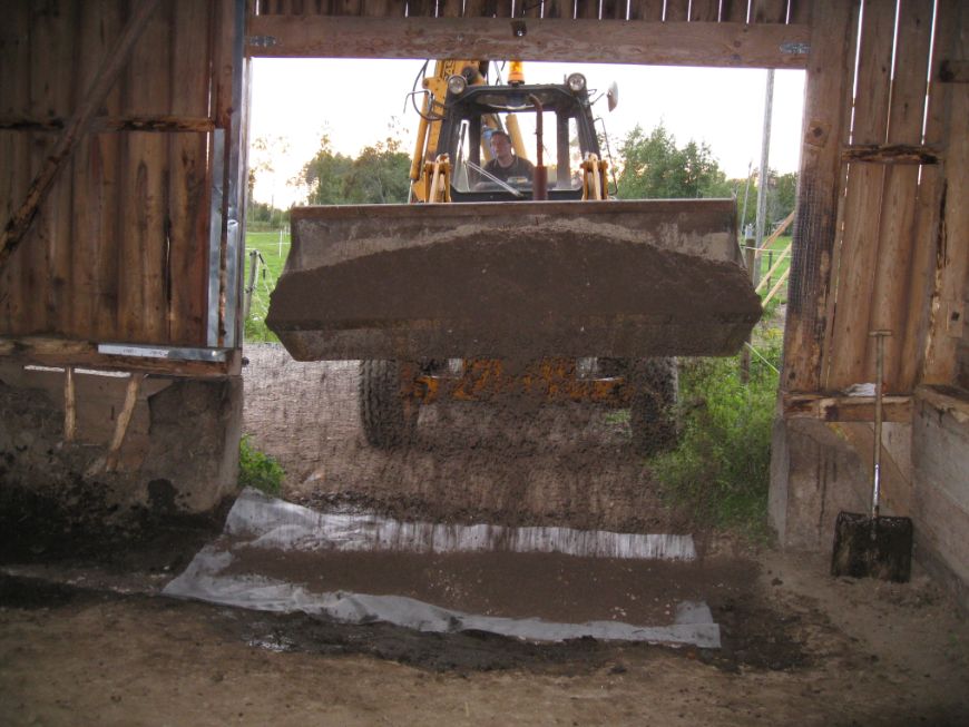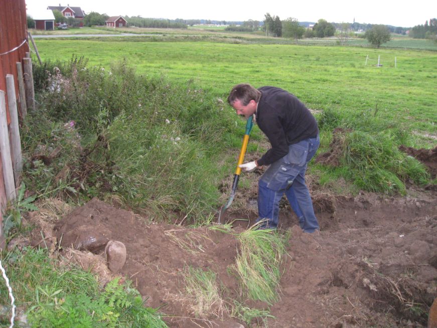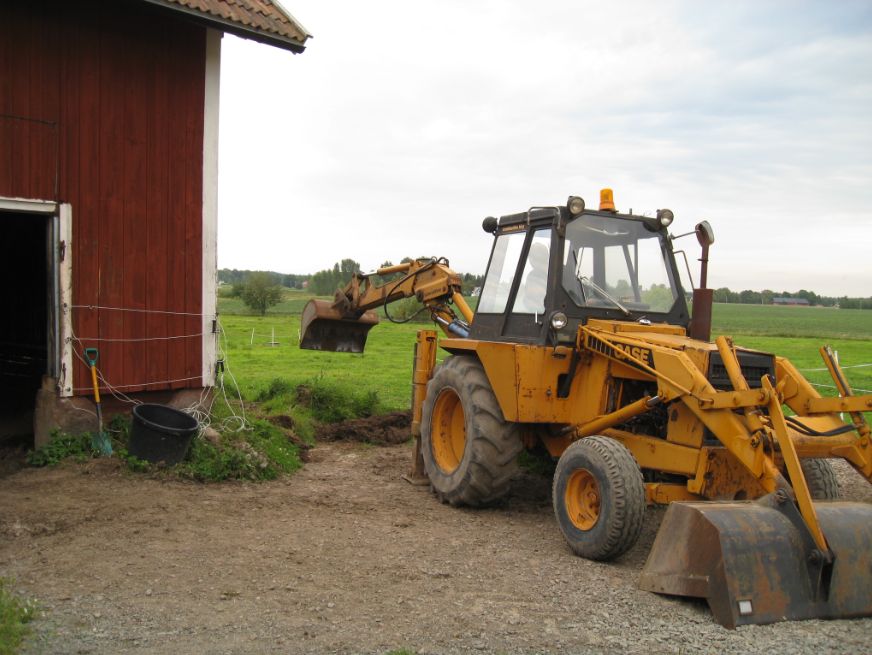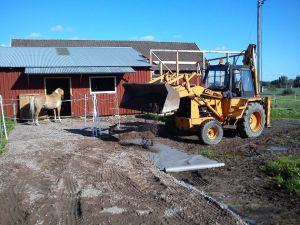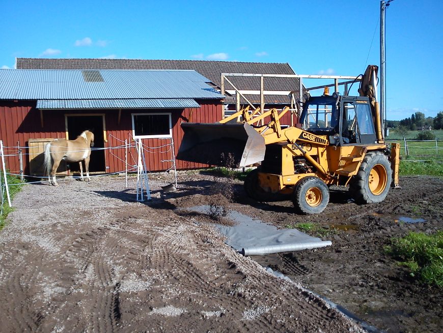 För att underlaget ska klara den påfrestning som blir utanför boxarna är vi tvungna att göra som vi gjort vid vattnet, grindarna och ligghallen: grusa upp. Schakta bort ytlagret, lägga på markduk och sedan grus. Alice följde arbetet med stort intresse!