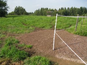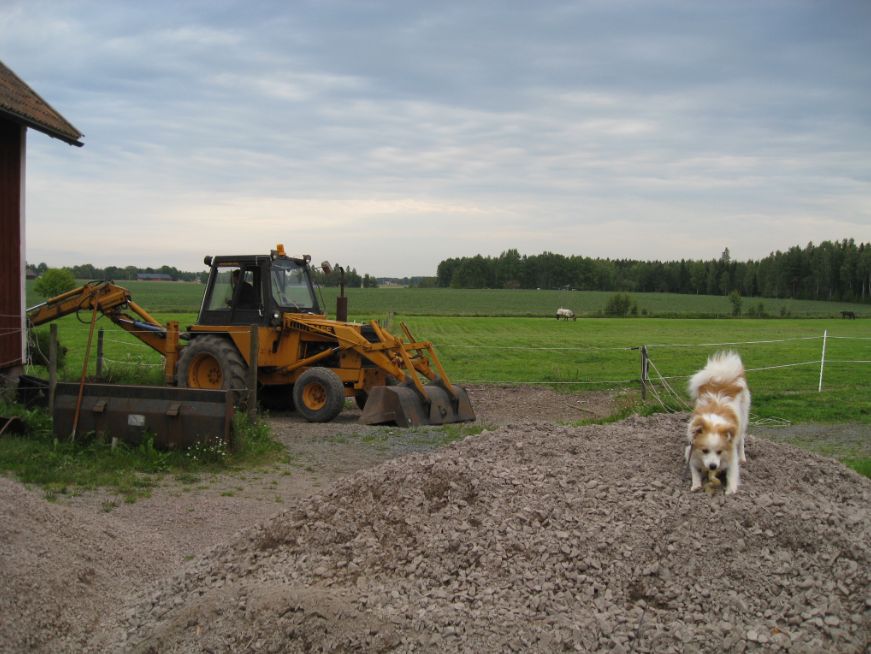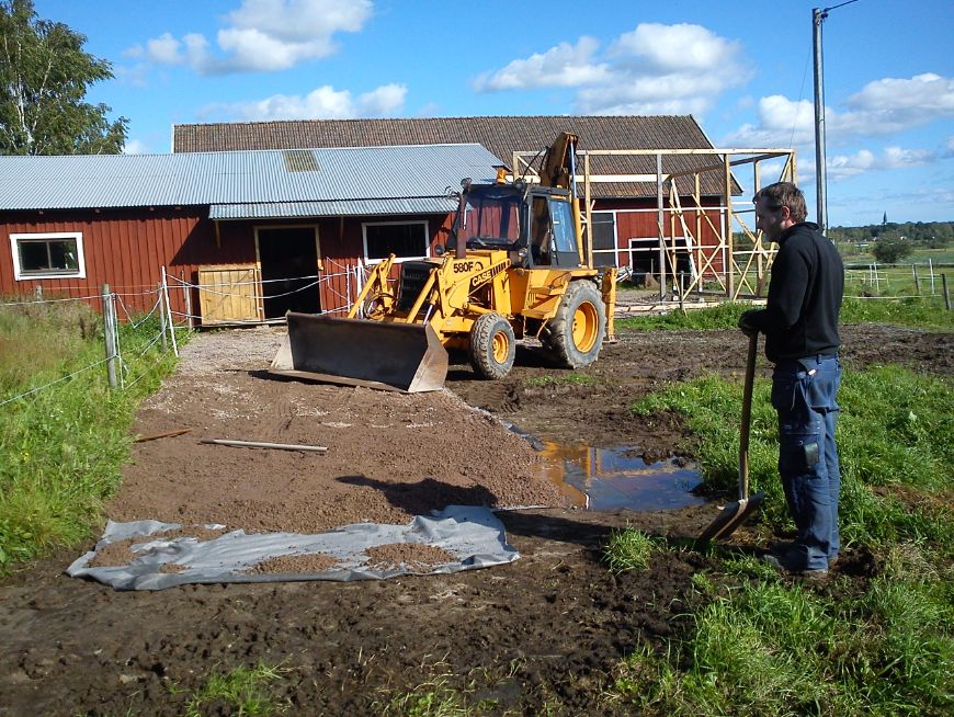 Magnus fortsatte grusningsarbetet idag. Jag hjälpte till lite, lite på slutet, men det var inte mycket dels för att det är lite för tungt arbete för min skräpkropp och dessutom var han nästan färdig när jag kom från att ha hållit i en dressyrlektion för Sara och Dacke. Utökningen av grusningen innebar också en större hage/fålla för Olle. Här är lite bilder:
