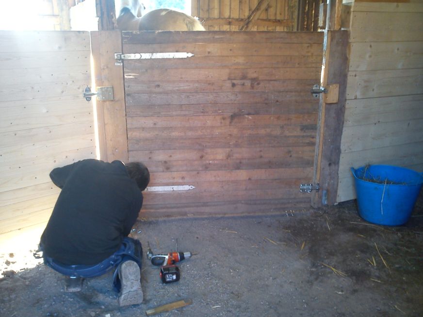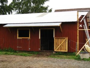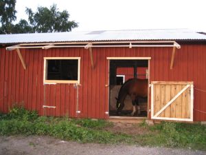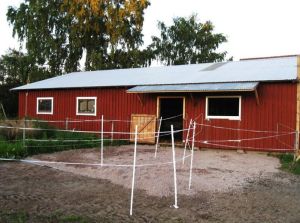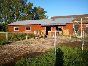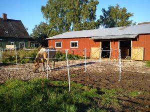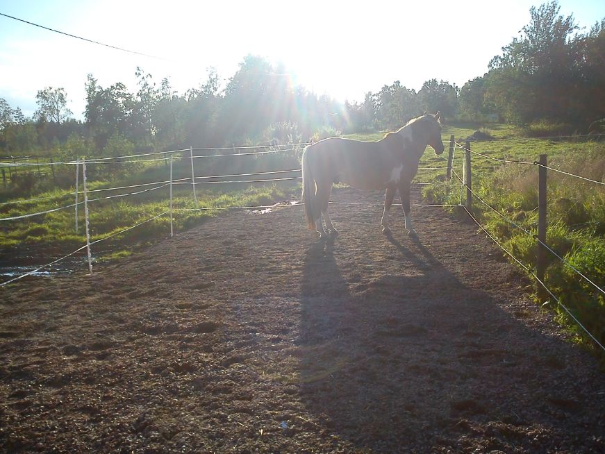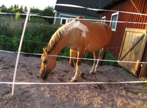 Jag kunde äntligen göra den lilla hagen utanför Olles box nu när vi grusade upp. Vi är ju inte färdiga med grusandet, fiberduken tog ju slut, men kunde i alla fall göra en liten, liten inhägnad. Han verkade nöjd, fina gubben! För den som inte hängt med så är alltså Olle en fånghäst (inte akut tillstånd längre, men under rehabilitering) vilket gör att han inte kan gå på gräs just nu. Boxen i sig är ju stor (godkänd som fölningsbox för ston upp till 170 i mankhöjd) så det går ju ingen större nöd på lille Olle, men nu har han alltså möjlighet att komma ut lite också. Angelica (hans ägare) är ju dock duktig och promenerar med honom varenda dag och ökar arbetet lite för varje vecka.