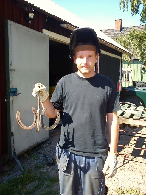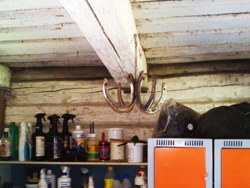 Magnus var gullig och hjälpte mig med lite saker idag: sätta upp en sadelhängare, byta ut sopborsthuvuden (två stycken) till befintliga skaft samt att han tillverkade en sådan här fin rengöringskrok av fyra hästskor: