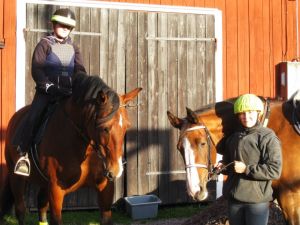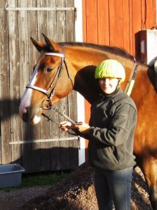På hemvägen satt jag i skritt på halvlånga tyglar när hon helt plötsligt viker av från vägen ner på en liten stig där det finns tre små ”hinder” i form av små, små stockar. Hon tyckte tydligen att vi skulle galoppera och hoppa över dem! Problemet var bara att hon inte nöjde sig med att studsa över stockarna, utan studsade minst lika mycket MELLAN dem! Det var inte läskigt på något vis utan jag satt och asgarvade under tiden och Sara likaså! Hahah! Rackarunge!