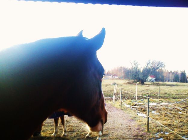 Det var en kall dag idag. Äntligen frusen mark som minskar markslitaget = ingen äcklig lera! Tog några usla bilder med mobilkameran. Första bilden på Alice blev ju så ful – hahah – hon ser ut som en tax med jättestort huvud! Kolla: