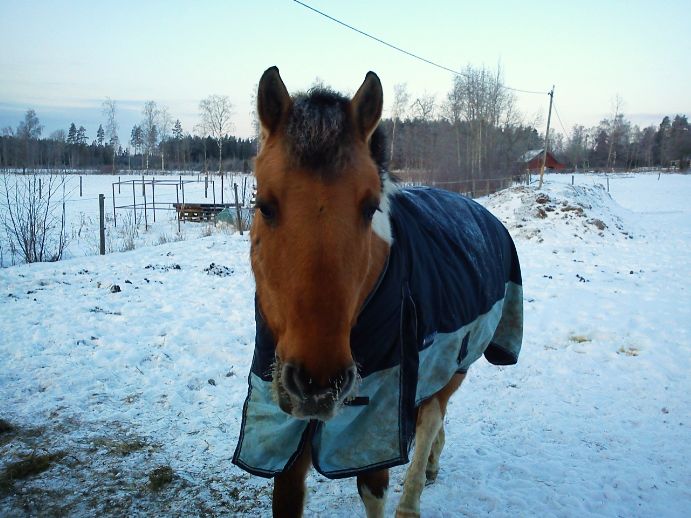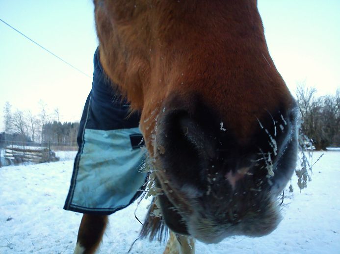 Nu är det så kallt att hästarna får frost lite här och var. Här kommer två bilder på en söt, frostig Olle som har frost på mulen och i pannluggen (hela manen och svansen också, men det syns ju inte på bilderna).