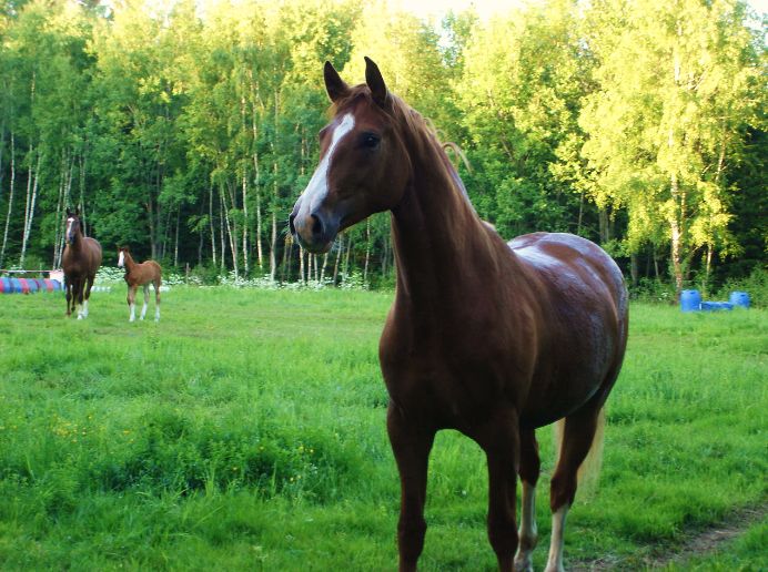 Hon är så mysig, min tjej. Hon är den mest sociala häst jag någonsin träffat! Det är verkligen jättemysigt med en häst som gladeligen är kring människor, nyfiken på allt och alla och gärna blir kelad med. Jo, det finns en häst till som är precis likadan och det är hennes halvsyster: ”Rosie” (Cap Roszania) som min syster äger. På bilden är det Rosie längst fram och i bakgrunden ser ni deras mamma ”Sita” (Cap Szantina) och lilla Alice som bebis! Bilden är från 2006 och därmed är Rosie två år på bilden. Sita var också social, men hennes töser tar priset!
