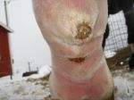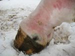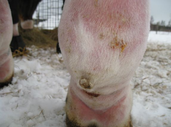 Min glädje över igångsättningen och de roliga hoppträningarna jag gjorde med Alice blev extremt kortlivad då hon har fått en infektion i bägge bakbenen så de svullnade upp och har några inflammerade sår. Jag hoppas innerligt att det inte blir som förra gången då hon fick skinnflådda ben, alla fyra ben blev som telefonstolpar, mängder med inflammerade och vätskande sår. Diagnos: Staphylococcus Aureus. Tyvärr glömde jag ta bild på hur det var som värst, på dessa bilder ser benen ”bra” ut jämfört med hur hon såg ut som värst.