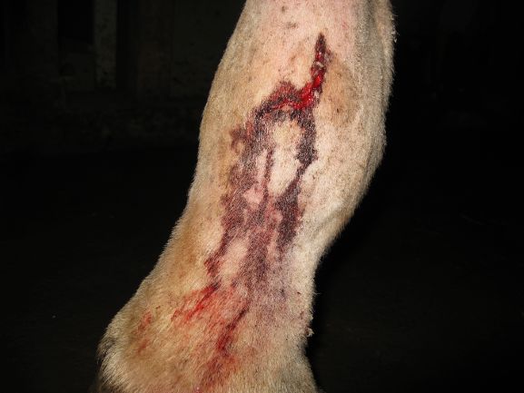 VAD TRÖTT JAG BLIR!! Finns det ingen ände på det här? Hon är ju världsbäst på att skada sig och få infektioner! Nu får det faktiskt räcka! Benen som äntligen började bli bättre. Vem vet vad denna nya skada kommer att orsaka? Ska jag få börja om helt från början? Skadan sitter givetvis på ett bakben till råga på allt. Det är bara till att hålla tummarna för att skadan inte kommer att påverka infektionen någonting.