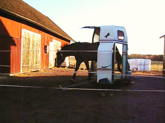 Så jag släppte istället lös henne på gårdsplanen (inhägnad, givetvis) så att hon fick göra vad hon ville. Det blev en del bus, lite kikande och sedan var hon faktiskt en hel del kring transporten och undersökte. Rätt vad det var så beslutade hon sig för att knalla in i transporten och ut genom fronturlastningen! Det roligaste av allt var att hon gjorde om det några gånger till! Jag fick med några av dem med kameran, så jag tänkte knåpa ihop en film! Tills dess får ni nöja er med en bild.