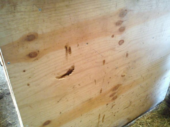 Det är verkligen tur att vi har förstärkt väggarna och dörrarna i boxarna för så här såg det ut efter att fröken Allison blev ensam i boxen (med väldans mycket överskottsenergi) när Angelica tog sig en ridtur på Olle igår.