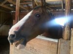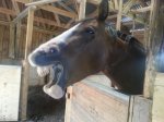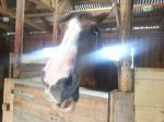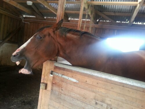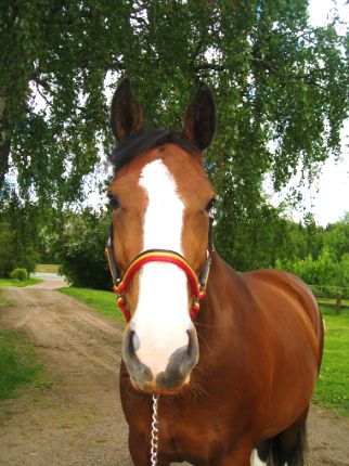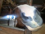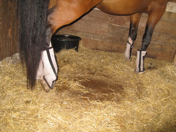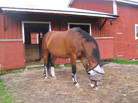 Alice är ju för rolig. Hon ska alltid kasta runt på maten – i det här fallet halm som hon får som mat under de timmar hon står inne. Som skydd från solen så står hon ju inne dagtid (för det mesta). Men, jag brukar ta in henne även när det är mulet för då blir det färre timmar för henne att gå och bli fet av gräset. Hur som helst. Det är SÅ typiskt Alice att kasta runt på maten. Hon har verkligen inget bordsskick. Hon gör det med krubbor och baljor också. Haha – rackarunge!