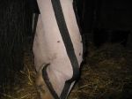 Jag köpte ju ett flugäcke från Börjes för en tid sedan, men det har inte blivit av att jag har använt det då det har så strävt tyg att det skulle skava på stumpan. Idag tog jag tag i det och sydde i nylonfodring i bogen så nu minskar förhoppningsvis risken för skav. Jag var trött och ville att det skulle gå fort så det blev väl inget mästerverk, men förhoppningsvis funktionsdugligt i alla fall. Jag opererade även bort halsen för hon avskyr ju halstäcken.
