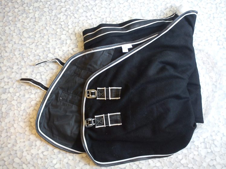 Sedan hittade jag ett svart ulltäcke av lite tunnare modell med ludd vid manken, kryssgjordar, dubbla bogspännen samt nylonfodring vid bogen (vilket jag tycker är ovanligt på ulltäcken). Det var – vad jag kunde se – det enda ulltäcket (av dem som ingår i premiärerbjudandena och kostar 199,-) som hade nylonfodring och så var det i Alices storlek! Vilken tur! Hoppas bara att det passar nu då.
