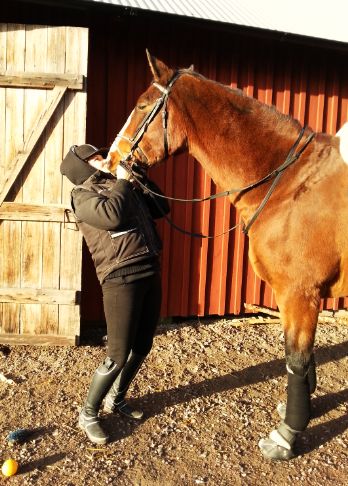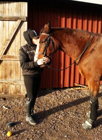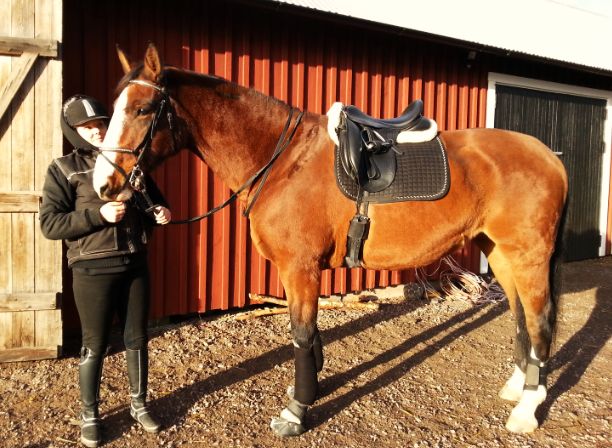 Igår höll jag lektion för Sara som red sin Dackeman (Daiko). Det blev en blandlektion där vi började med dressyr, gick vidare till markarbete och avslutade med två skutt över ett lite kul hinder som var en trippelbarr med ytterligare en bom framför så vad ska man kalla det? En kvadrupelbarr? Längdhinder var det i vilket fall som helst! Målet med träningen var ändring av tempo/steglängd – att kunna reglera hästen i såväl dressyr som med bommar och hinder.