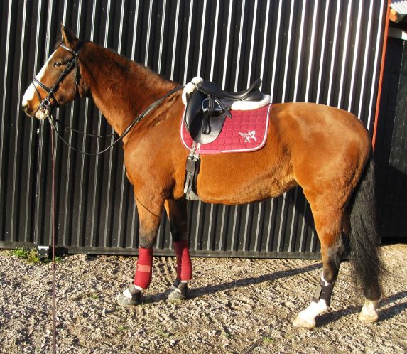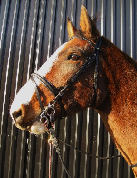 Även bettet är nytt och detta är tredje dagen på raken som jag använder det. Det är ett så kallat Babypelham, det vill säga ett pelham med korta skänklar. Med deltorna så har bettet mer eller mindre samma verkan som ett kimblewick/jaktkandar vilket var det jag kollade på först. Skillnaden mellan de två betten var att detta hade en mycket trevligare mundel då den – trots att den är gummibeklädd – är väldigt smal (15 mm) jämfört mot jaktkandaret som var väldigt tjockt. Jag kommer att göra en utvärdering vid ett annat tillfälle.