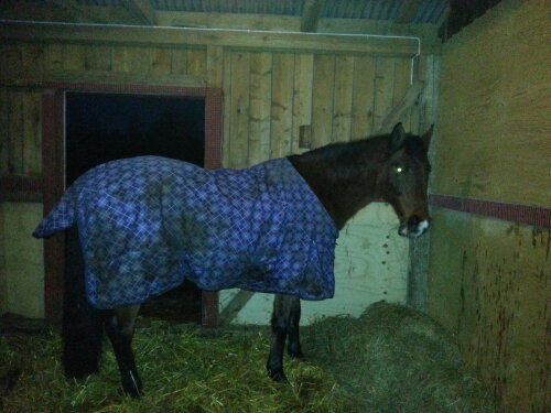 Det fick bli longering idag igen. Idag jobbade jag honom mer inspänd samt även över bommar för att aktivera honom lite mer. Det regnade när jag gjorde iordning honom så han fick (det fina) skrittmaskinstäcket på sig. Men, lagom till att jag började longera så avtog regnet och vi blev knappt fuktiga, än mindre blöta. Det var ju förstås ingenting negativt, dock!