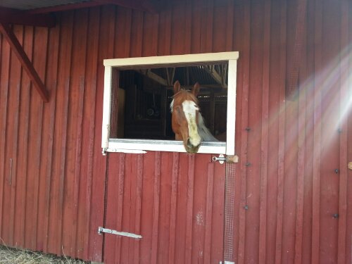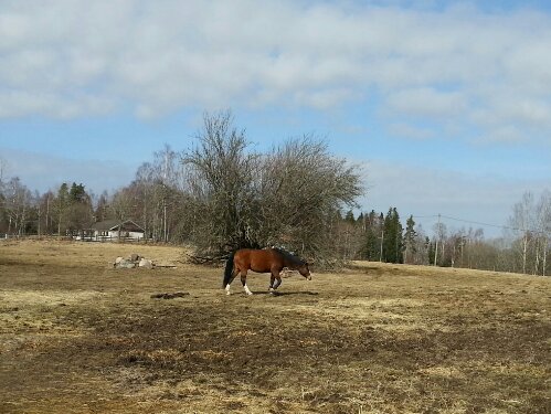 Idag provar jag att ha Alice i hennes vanliga hage för att se om benet klarar det ojämna underlaget. Hon såg väldigt nöjd ut när hon knatade iväg, medan Dingo blev ledsen över att bli lämnad i stallet (även om han visserligen har öronen framåt på bilden).