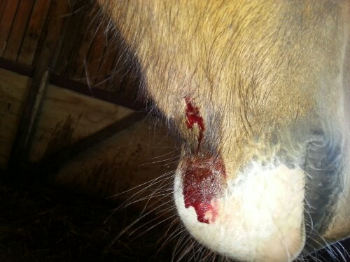 Nu har hon skadat sig igen. Hon blev sur på Dingo och gjorde då ett utfall vilket resulterade i att hon först slog i huvudet/nacken mot fönstret/boxens öppning och då reagerade hon genom att hastigt kasta ner huvudet rakt mot dörren och slog då upp ett sår. Klant!!!