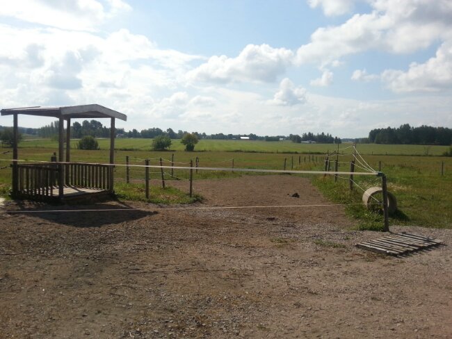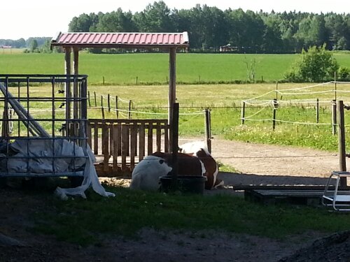 Så här såg det ut igår när jag kom ut till hästarna. Dingo eller Dacke hade lyckats kroka av grinden till höhuset och sedan placerat den UTANFÖR hagen! Ehh… Hur lyckades de med det? Vad pysslar de med där ute egentligen?
