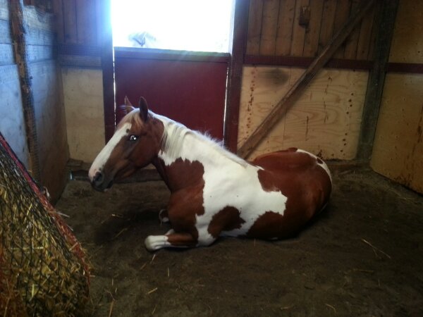 Söta Dingo låg ner i boxen i morse och jag passade då på att fånga sötnöten på bild. Att han stod inne var för att han skulle vara så still som möjligt efter kortisonsprutan som han fick igår. Han fick sedan göra Dacke sällskap i hagen på förmiddagen.