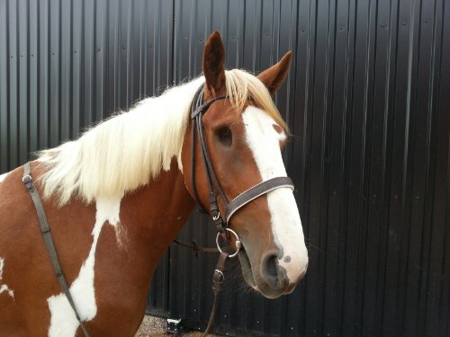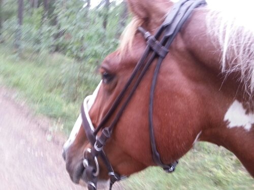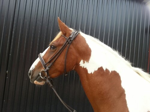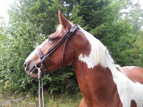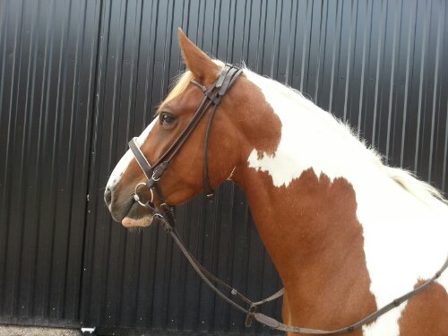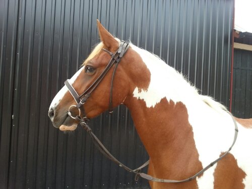 Han fick ha ett – för mig – nytt träns. Ett begagnat, brunt, rundsytt träns med vitfodrad engelsk nosgrimma.