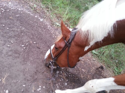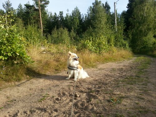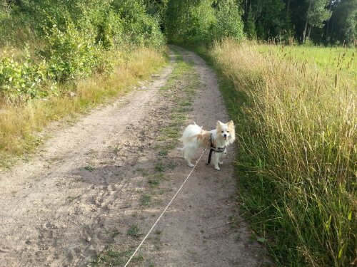 Det blev dock ett litet uppehåll när jag skulle träna honom på att gå i de mörka före detta vattenpölarna (alltså vattenpölar där vattnet har försvunnit, men marken inte har torkat än så det är mörkare jord där än på övriga vägen). Han tyckte att konstiga, mörka fläckarna var lite läskiga, men efter lite undersökning så gick det bra. Han tittade, luktade, smakade och sen trampade på det.
