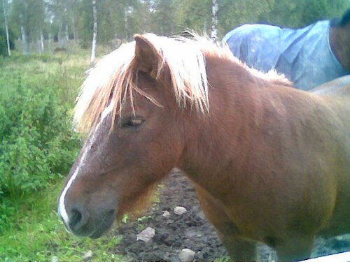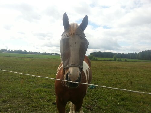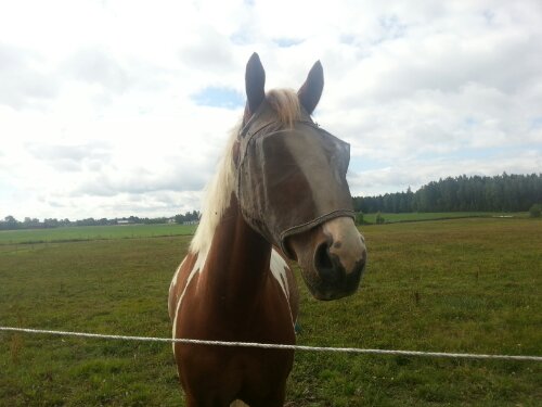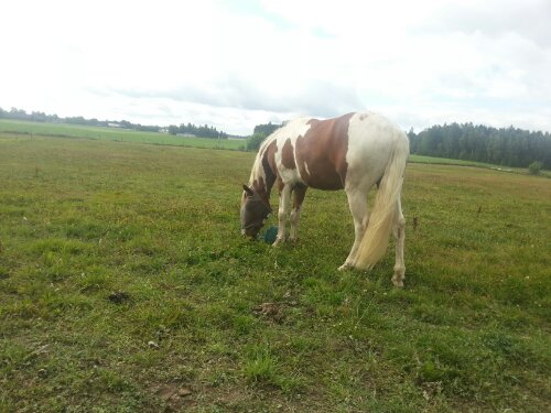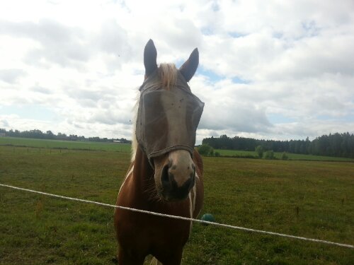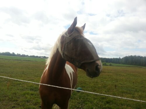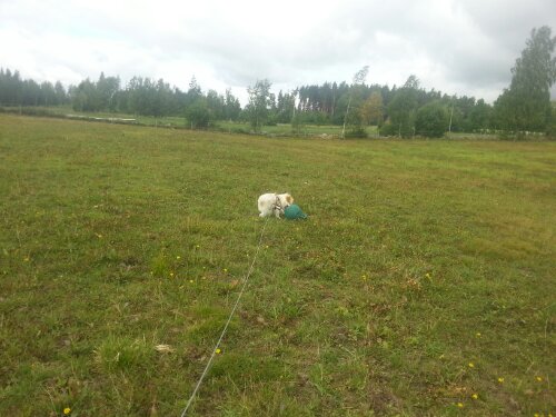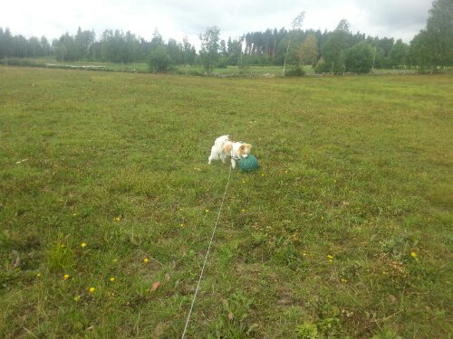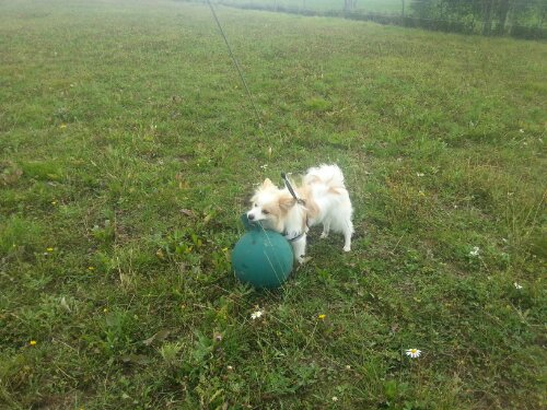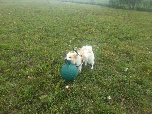 Jag gick med Gizmo ute i hästarnas hage för att leta efter Dingos flughuva som han hade fått av sig. Där hittade Gizmo hästbollen och gick genast till attack! När vi lekt med den en stund så gick vi vidare och då var han så stolt när han klarade av att bära och släpa på den! Hahah – sötnöt!