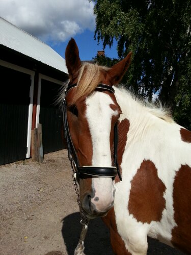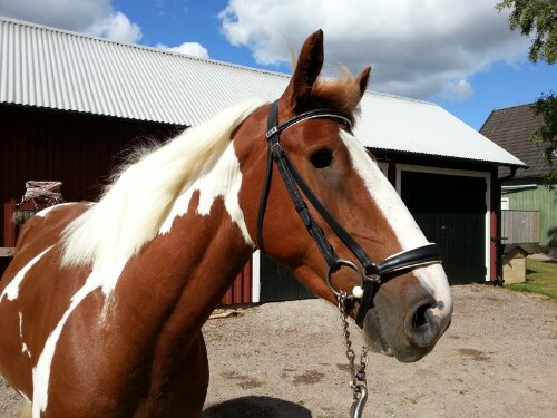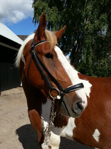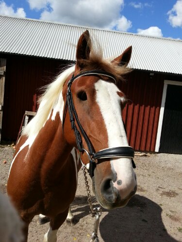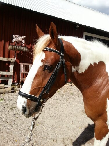 Jag har varit ute på en solig skogspromenad med Dingo. Jättemysigt! Dagens träns blev ett vitfodrat Stübben med remontnosgrimma som han enligt mig är jättesöt i.