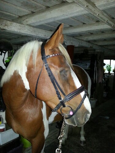 Dagens träns var svart med vinröda detaljer. Jag vet inte vad märket heter, men det är engelsktillverkat i alla fall och av bra kvalitet – som engelska träns brukar vara.