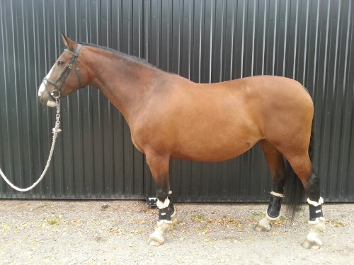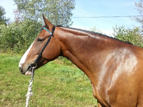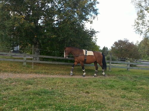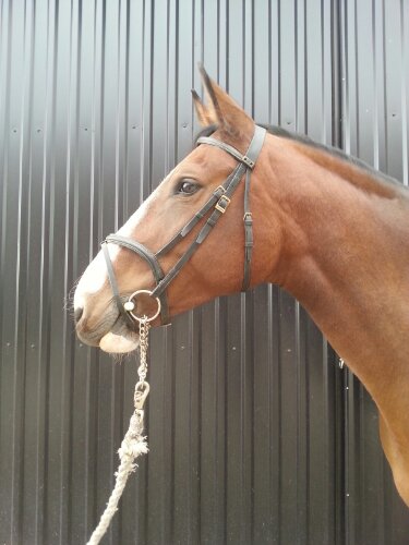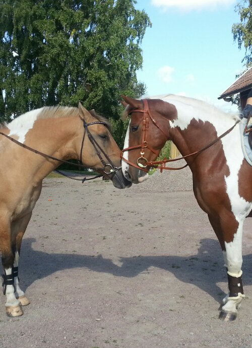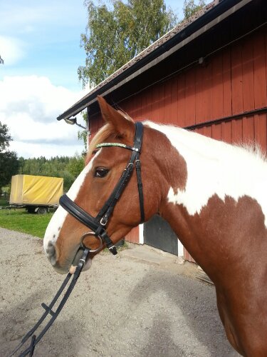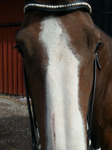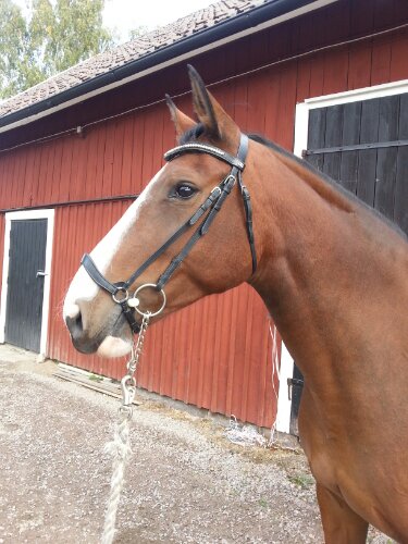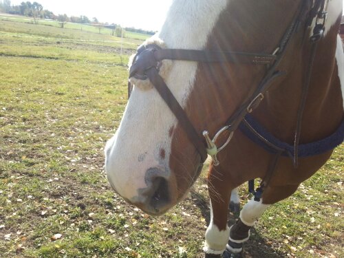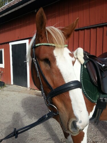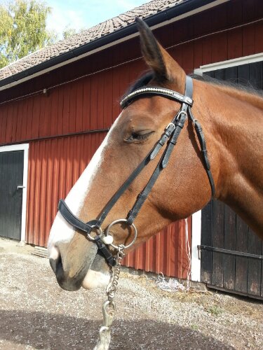 Dagens träns var ett pullarträns i london/new tan (eller vad ni vill välja att kalla färgen) med mörkbrunt foder på nackstycke, pannband och nosgrimma. Guldfärgade spännen. V-format pannband som dock inte riktigt syns på bilderna. Bettet är ett Jacson som han verkade trivas bra med.