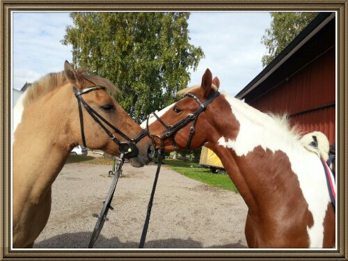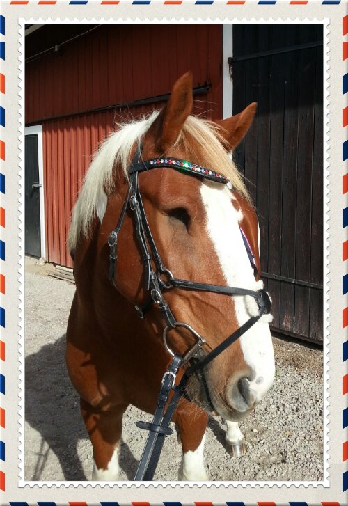 Som ni ser så gick utrustningen i blått, vitt och rött. Tränset är ett Kieffer, pannbandet är ett HL Equipment och tyglarna är Zaldi. Schabraket är från Börjes. Benskydden är av märket Norton. Bettet är ett tredelat, anatomiskt D-bett från Horse Power. Fårskinnspaden köpte jag nog på Ge-Kås om jag inte minns helt fel.