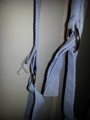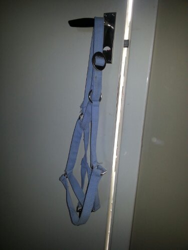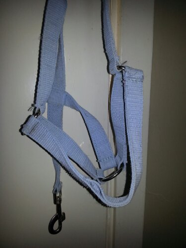Begagnad, ljusblå grimma i storlek full. Har några skavanker (se bilderna) som jag inte orkar bry mig om att rätta till (är ju bara att sy fast igen, men jag har för mycket annat att göra) och säljes därför för endast en femma.