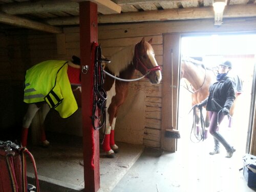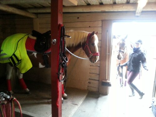 Brrrr – vad kallt det är idag! Mulet och ruggigt med kalla vindar. Men, vi gav oss ut på tur med våra goa hästar. Stackars Alice blev dock ensam kvar. Vi red ner till banorna där jag tränade på att få Dingo att gå nära staketet och ut ordentligt i hörnen samt att han inte ska bry sig om vad andra gör utan att han ska lyssna på mig och gå dit jag vill. Han var JÄTTEDUKTIG!!! SÅ redig liten pojk. Han är så go, lille Dingo. Snälla, håll alla era tummar och tår att han får bli smärtfri från sin spatt så att han kan fungera som ridhäst, eller rättare sagt så att han får leva ett bra liv. Blir han inte smärtfri så måste han ju tyvärr tas bort och det vill jag ju absolut INTE… Så, som sagt, håll tummar och tår.