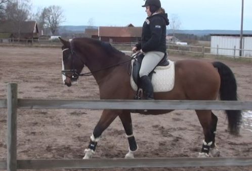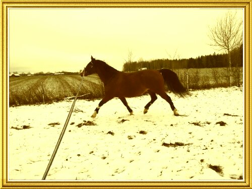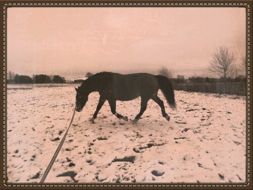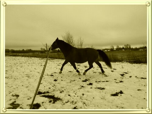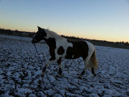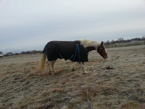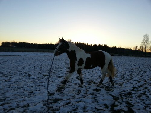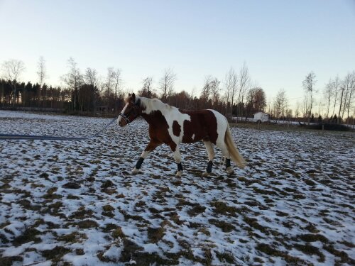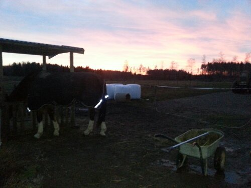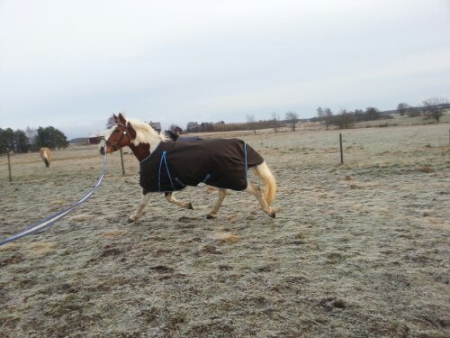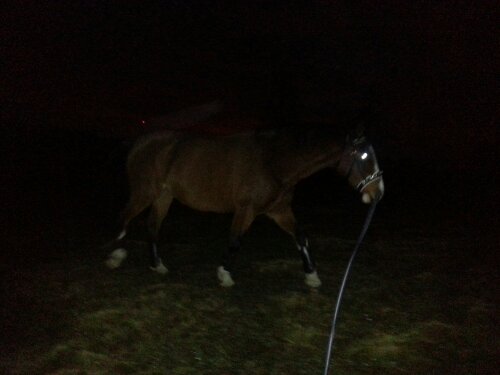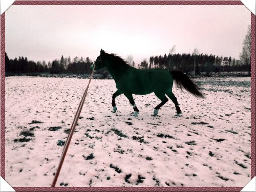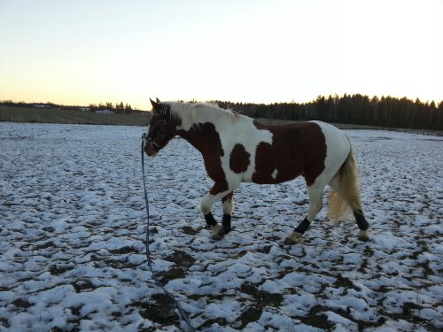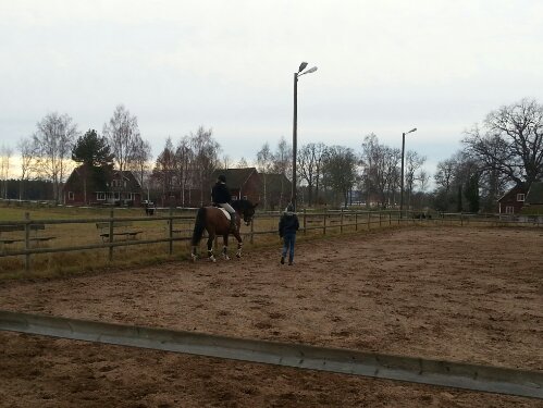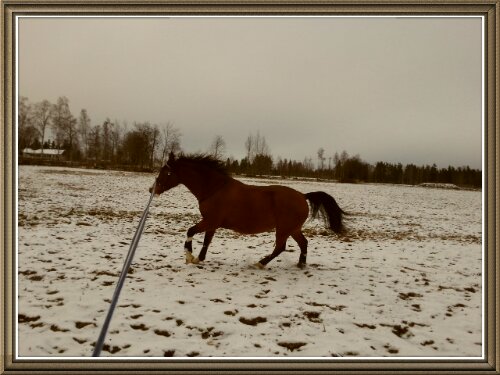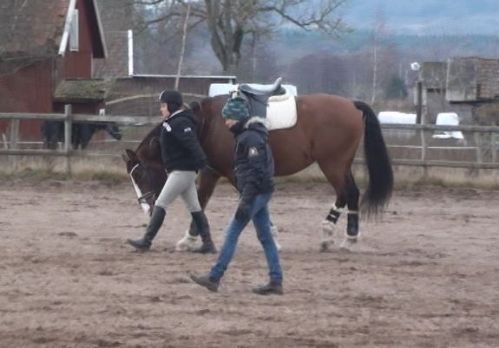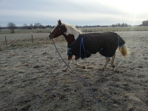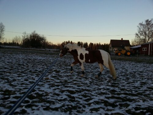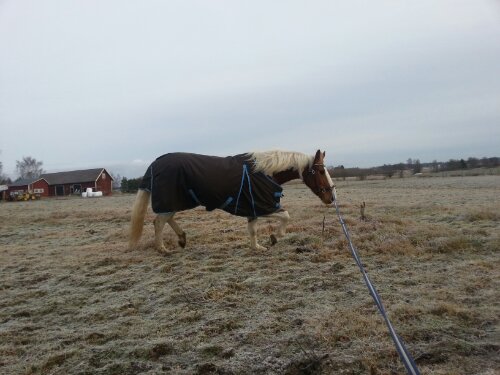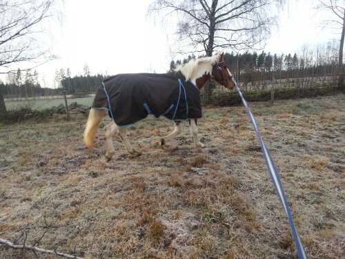 Sedan var det dags. Äntligen var ögonblicket som jag har väntat på här! Nu var det upp till bevis – skulle han klara att bli förspänd, eller skulle han få panik? Sara och jag tog varsin longerlina och gick på varsin sida om honom som ett moraliskt stöd samt för att ha bästa chans att få stopp på honom ifall han skulle bli rädd och vilja fly.