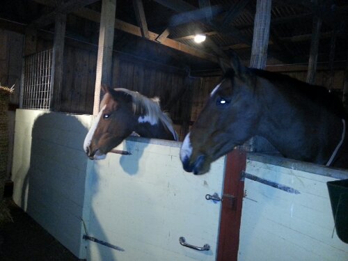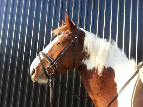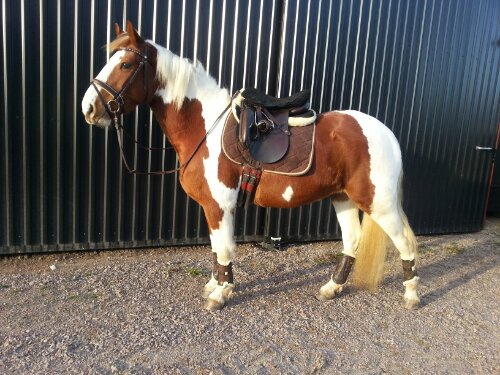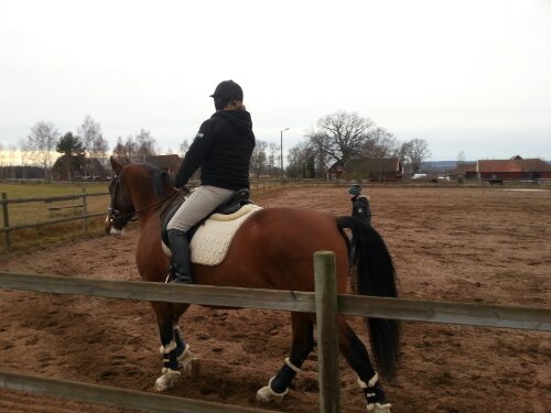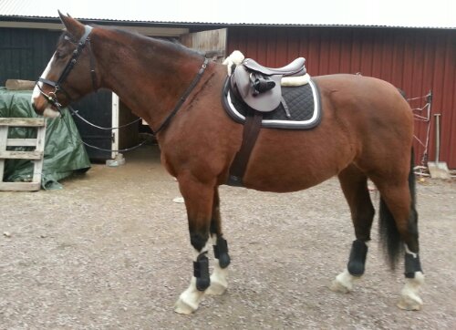 Selet är ett nylonsele från selar.se. Kapsonen är en Bucas. Benskydden är märkeslösa damasker köpta på Börjes. Den ena longerlinan (blå/vit) är köpt på Ge-Kås, den andra (marin/grön) är av märket Horse Saver. De gröna selunderläggen är från Börjes. Jag tror att även det svarta bröstluddet är därifrån.