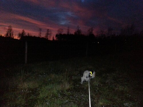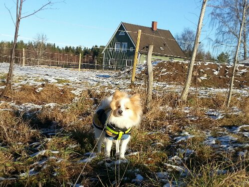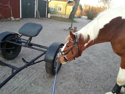 Dingo har dragit vagnen för första gången idag! Angelica och Sara var snälla och hjälpte mig. Jag har ju förberett honom med att han har fått undersöka den, gå över skaklarna, gått framför, bakom och vid sidan av den när man själv/någon har dragit vagnen, ställt honom mellan skaklarna (så att han har känt dem utmed sidorna) och idag drog även tjejerna vagnen på det viset innan vi spände för – som en sista koll att han inte skulle få panik av att känna sig ”fångad” mellan skaklarna.