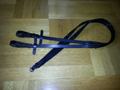 Helt NYA, svarta vävribbtyglar storlek ponny med tygelhakar och vita sömmar. Jag vet tyvärr inte märket, men lädret känns som om det är av bra kvalitet.