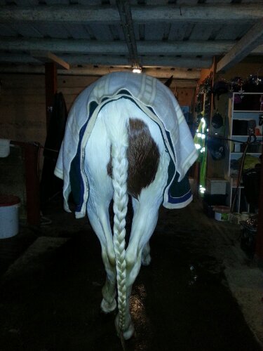 Senare på kvällen, när det växlade mellan uppehåll och endast lite duggregn, så passade jag på att tvätta 2/3 av Dingo då han har varit SÅ sunkig efter att han hade rivit upp bädden och därefter legat i det (rullat?). Dessutom var svansen helt brun av bajs. Mysigt värre…