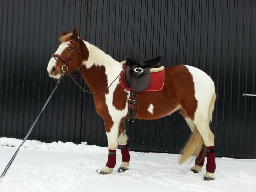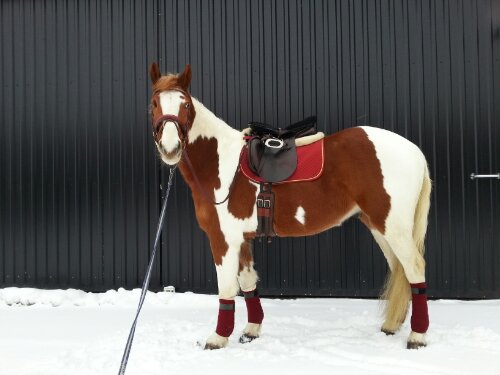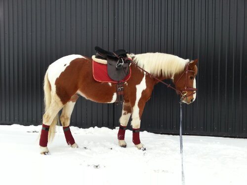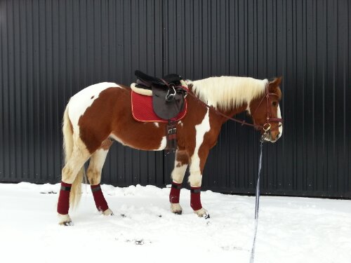 Stübben Tristan DL dressyrsadel med Claridge House stigläder, islandsstigbyglar (vet inte märke), Showmaster (tror jag) schabrak, Eskadron neoprenpad, HKM fårskinnspad, Action Horse sadelgjord, Lippo rumpvärmare i teddy och under den finns en gelsits (vet inte märke).